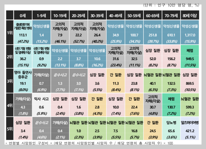 연령별 5대 사망원인 사망률 및 구성비, 2023 : 통계청 자료
