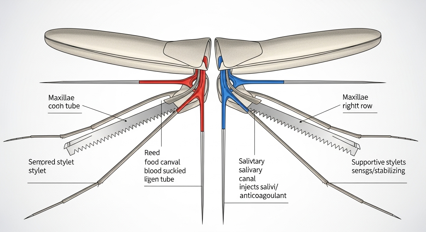 보이는 ‘주둥이’는 외피일 뿐, 실제로는 6개의 침 구조가 피부 안으로 들어갑니다. 피를 빠는 흡혈관, 침을 뱉는 타액관, 양쪽의 톱니침, 단순침까지 총동원해 정확하게 모세혈관을 탐색하고 흡혈합니다.