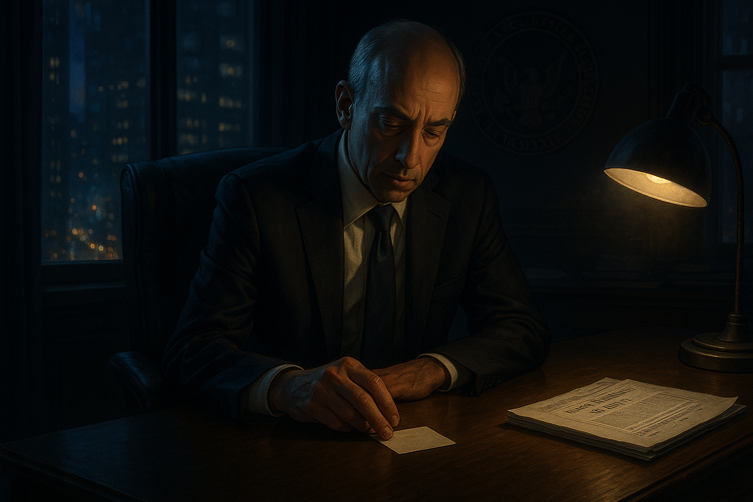SEC의 불 꺼진 사무실. 그는 마지막 서명을 하고 있었다.