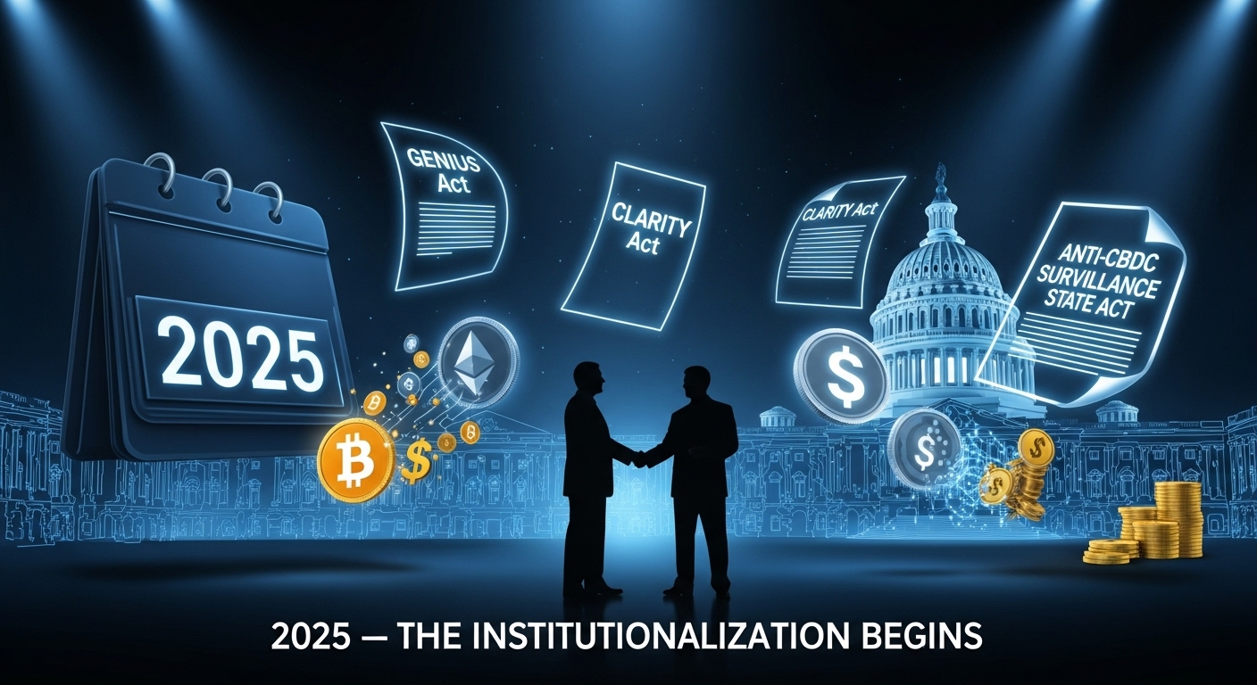 - 🔹 2025년 ‘GENIUS Act’, ‘CLARITY Act’, ‘Anti‑CBDC Surveillance State Act’ 등 3대 크립토 법안이 의회를 통과하며 법제화가 본격화됨.