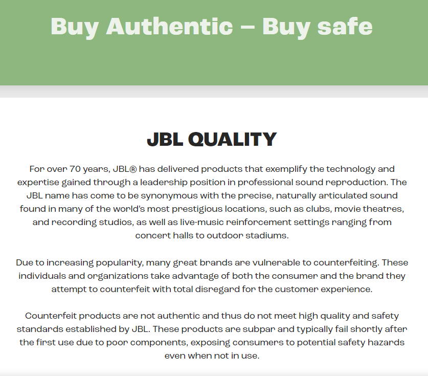 하지만, 공식 JBL사의 입장은 정품을 사용하라입니다. 카피제품이 있을 수 있음을 경고하고 있습니다.